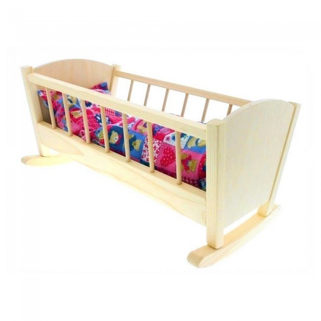 Un lit-berceau en bois pour bercer une joile poupée avec un oreiller et une couette. Ce lit en bois massif accueillera une poupée de taille inférieure à 40 cm.
