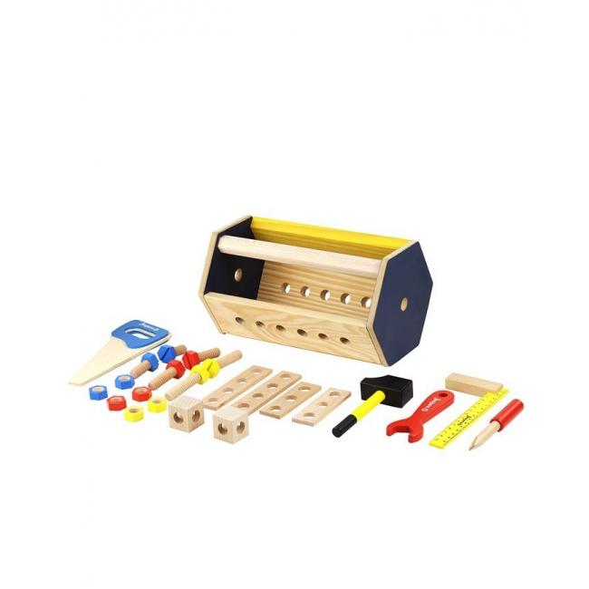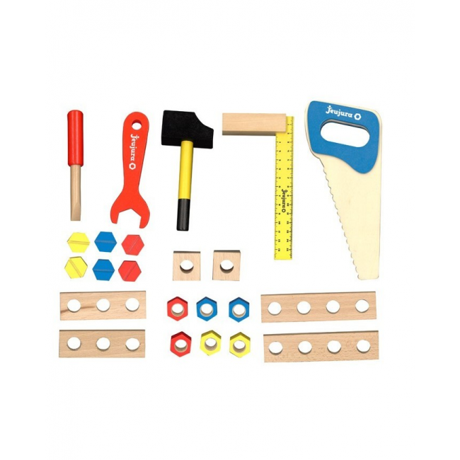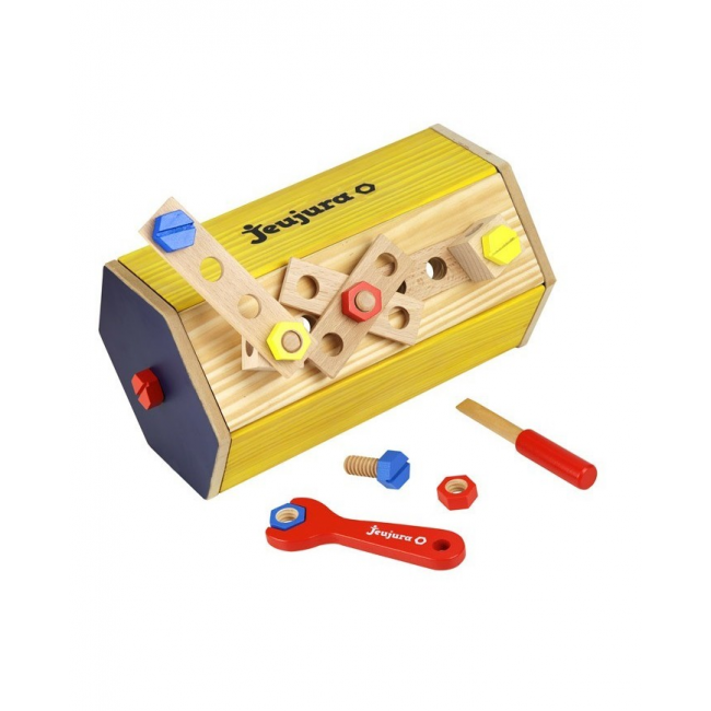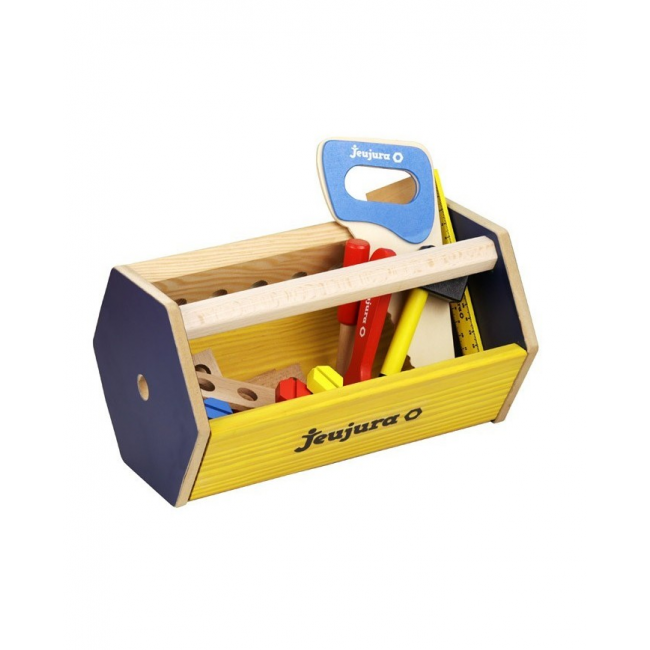 Cette caisse à outils complète de Jeujura en bois est très fonctionnelle, elle permet aux enfants de s'amuser à réaliser des constructions grâce aux nombreux outils et ses modèles inclus. La caisse à outils en bois comprend : marteau, scie, tournevis, clé, équerre avec un kit de pièces à assembler (pièces et plaques perforées, vis et écrous).