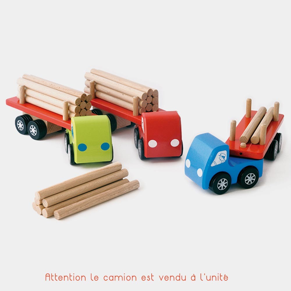 Un beau camion coloré qui transporte des grumes de bois ou autre chose.....Un jouet en bois de qualité pour des heures de jeux.