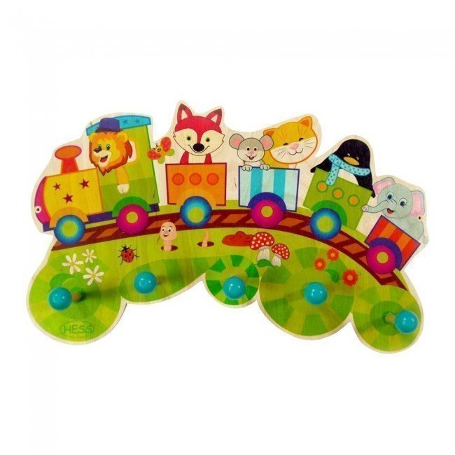 Ces animaux ont bien compris que pour se déplacer, il était plus facile de prendre un petit train...Une jolie scène pour illustrer ce porte-manteaux comprenant 5 patères.