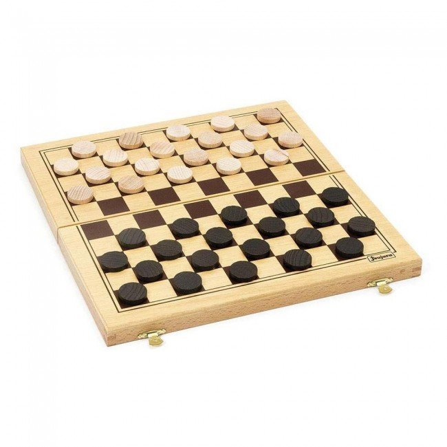 Un coffret compact pour jouer aux dames. Pions en bois diamètre 24 mm.