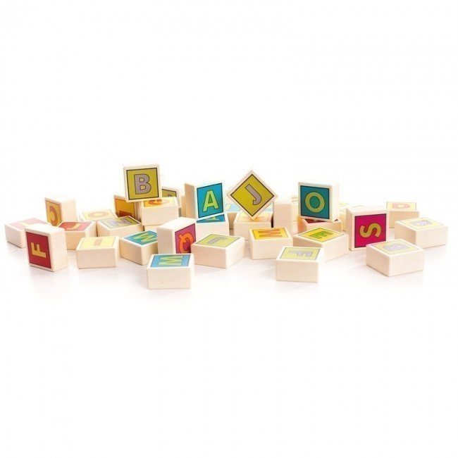 Des cubes en bois, éléments de base pour l'apprentissage de l'alphabet tout en s'amusant. Les blocs sont imprimés recto/verso.