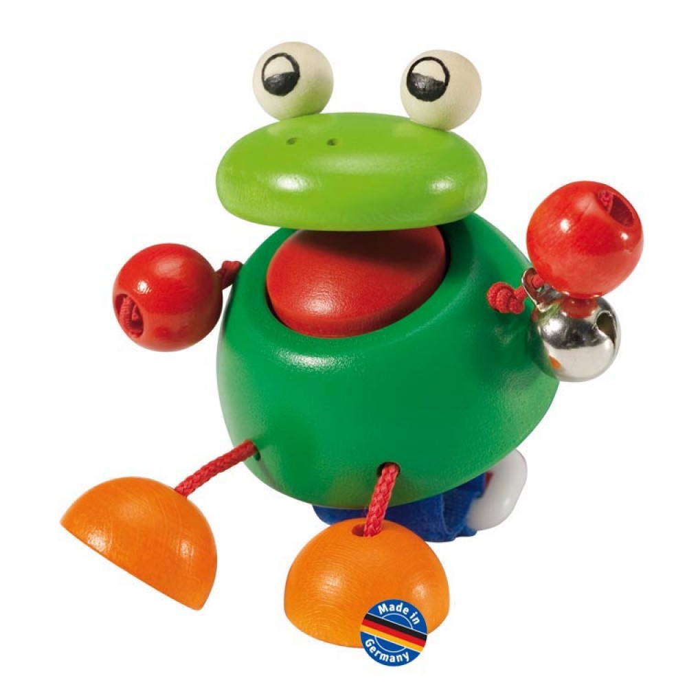 Une grenouille en bois aux yeux rigolos, qui "queek" et qui tinte. Un jouet en bois idéal pour la poussette. Avec sa bande velcro, on peut l'attacher simplement et en toute sécurité à la poussette.