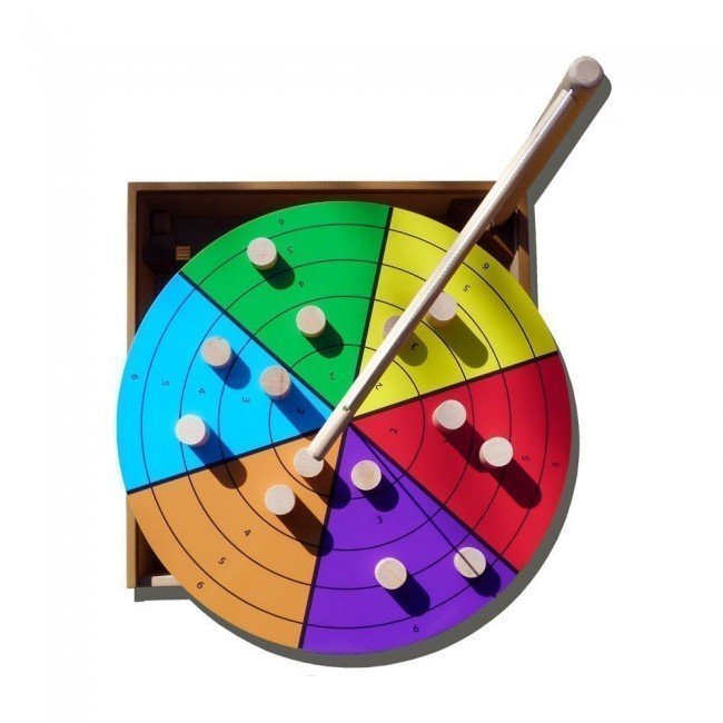 Règle du jeu : Les joueurs lancent à tour de rôle les 2 dés. Le dé de couleur détermine la zone de couleur et le dé numéroté indique l’emplacement de son pion. Le gagnant est le joueur qui aura posé tous ses pions le premier.