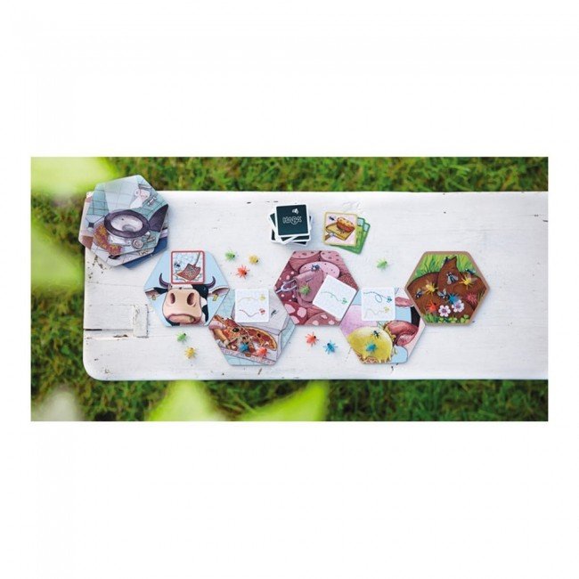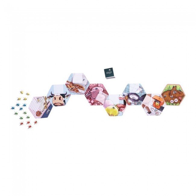 Bzzz, des mouches bourdonnent tout près d’ici. Malgré toutes les pistes d’atterrissage attrayantes, elles convoitent toutes le « dégoûtant festin » de couleur brune. Celui ou celle qui posera ses cartes de façon astucieuse pourra faire voler ses mouches rapidement ! Mais attention : personne n’est à l’abri de la carte « tapette à mouches », et même proches du but, de nombreuses mouches devront retourner à la case départ.