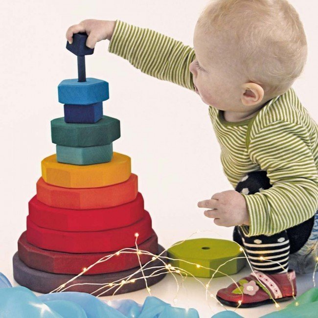 Avec la grande tour, votre enfant s'amusera avec les 11 formes en bois à empiler, trier, construire...Un jeu de motricté recommandé à partir de 12 mois.