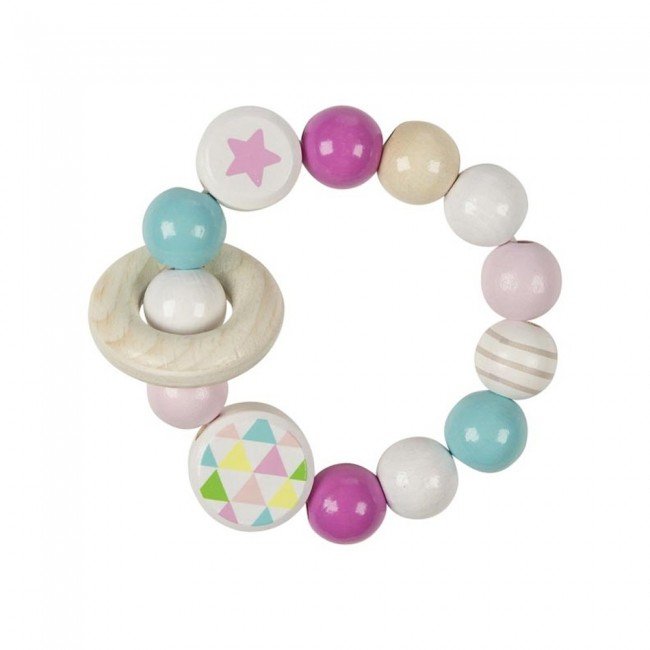 Un hochet flexible pour développer les capacités d'agrippement de bébé et l'accompagner dans la découverte du monde qui l'entoure. Ce hochet est composé de perles colorées et d'un anneau en bois montés sur un élastique. A assortir avec l'attache-tétine Etoile, la chaîne de poussette étoile, le trapèze en bois étoile