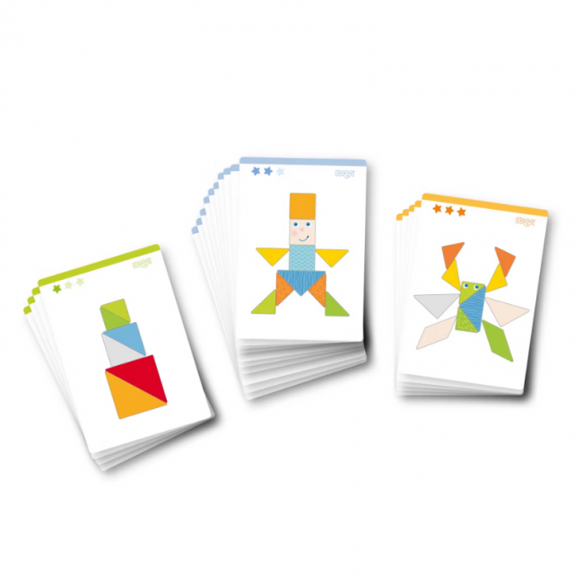Assemblez les tuiles multicolores et donnez vie à de nouvelles formes et silhouettes géométriques. Plusieurs possibilités d'assemblage selon les modèles proposés ou librement. Un jeu recommandé pour les petits artistes.