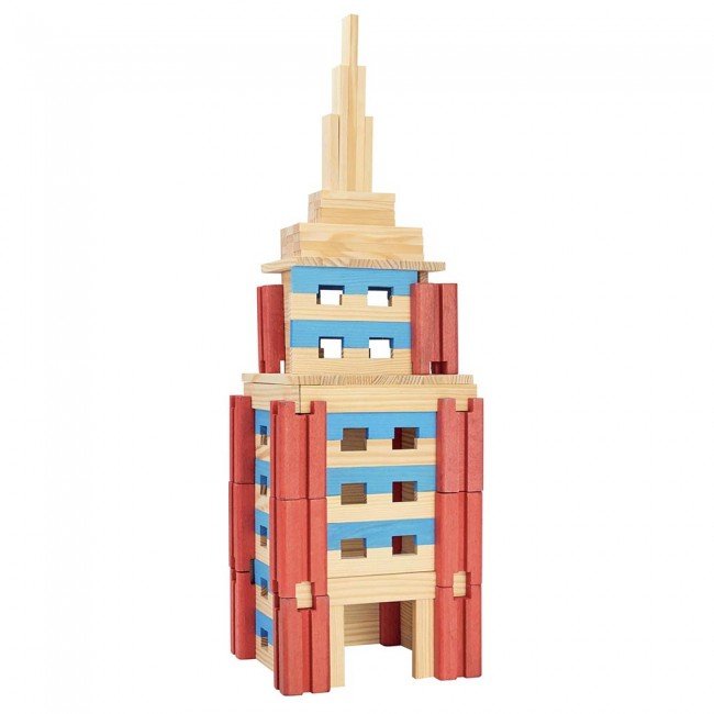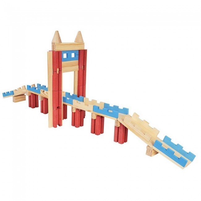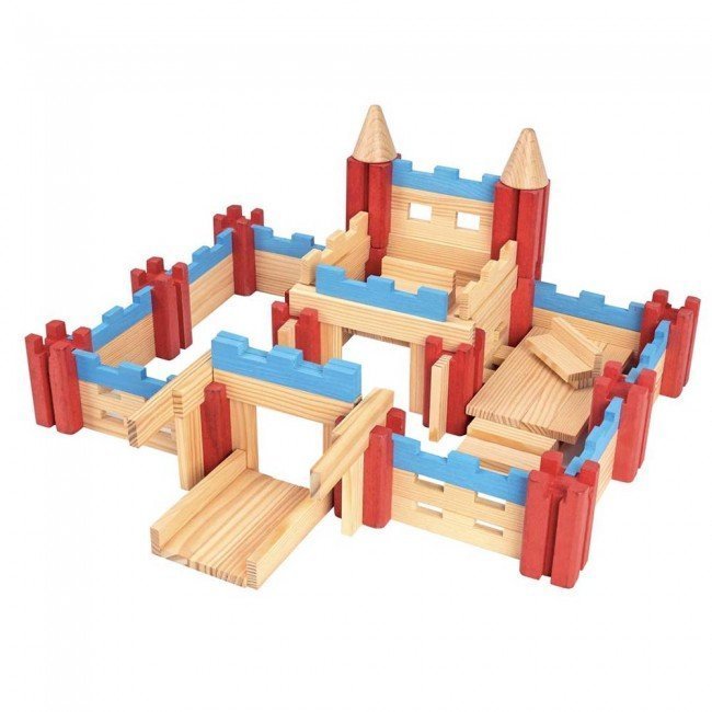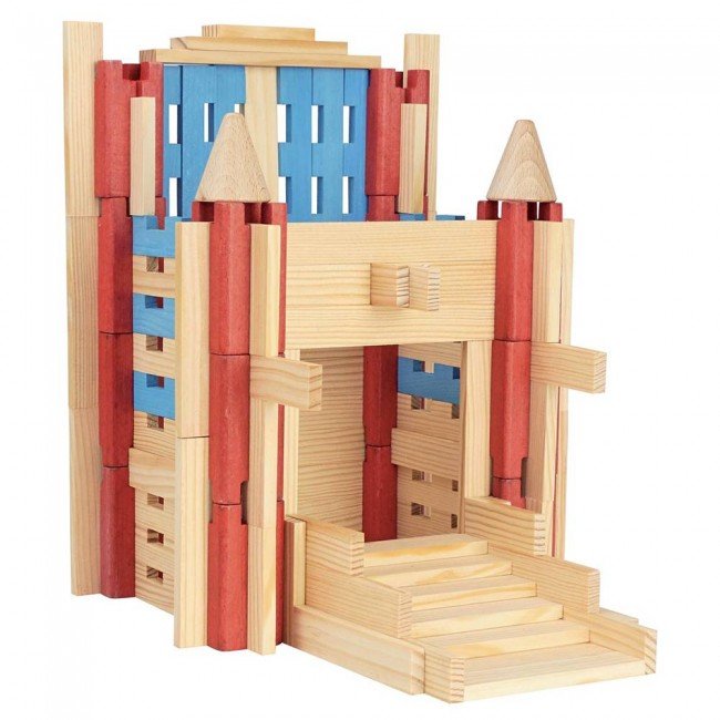 Les 120 pièces du jeu en bois permettent aux enfants de développer leur habileté et leur imagination en réalisant de multiples constructions (maisons, châteaux, tours, ponts, ...).