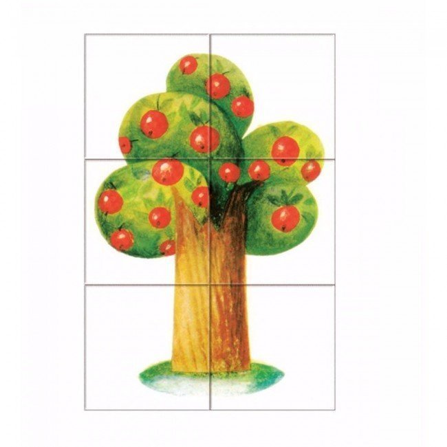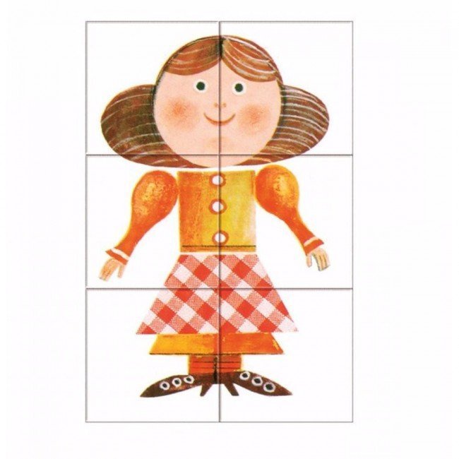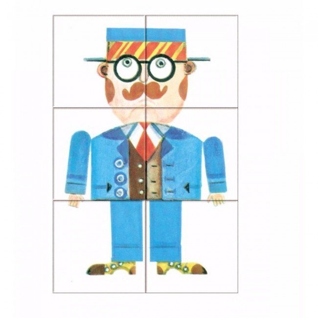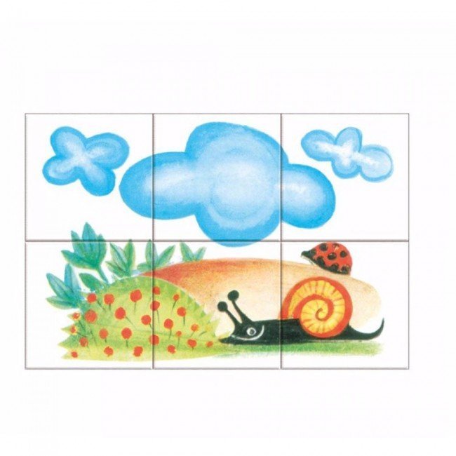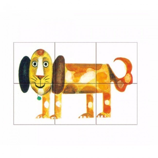 6 cubes en bois recouverts d'une image en papier. 6 images différentes à reconstituer pour découvrir : un chien, un canard, deux personnages, 1 paysage et 1 arbre