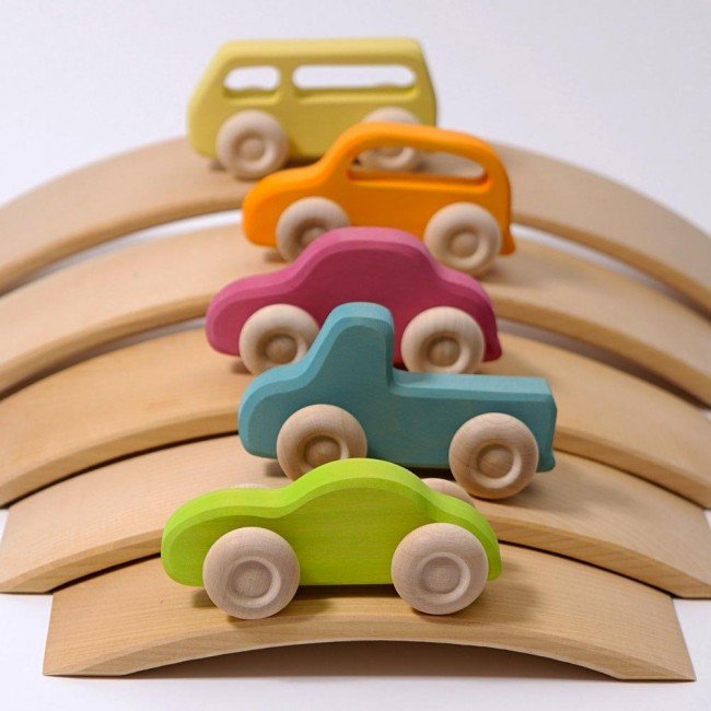Cinq voitures en bois à la ligne épurée et aux courbes harmonieuses pour s'amuser et créer ses circuits de jeux. Faciles à prendre en main pour les enfants dès 12 mois, découvrez la limousine, le pick-up, le bus, la voiture de sport et la fourgonnette. Cinq voitures à associer avec les éléments de la gamme WOBBEL et Grimm's notamment.
