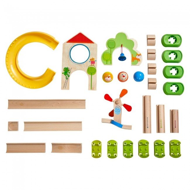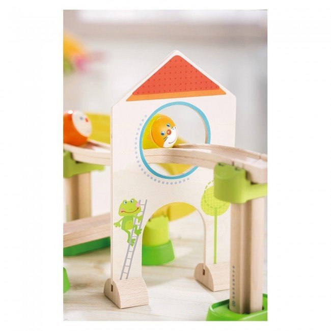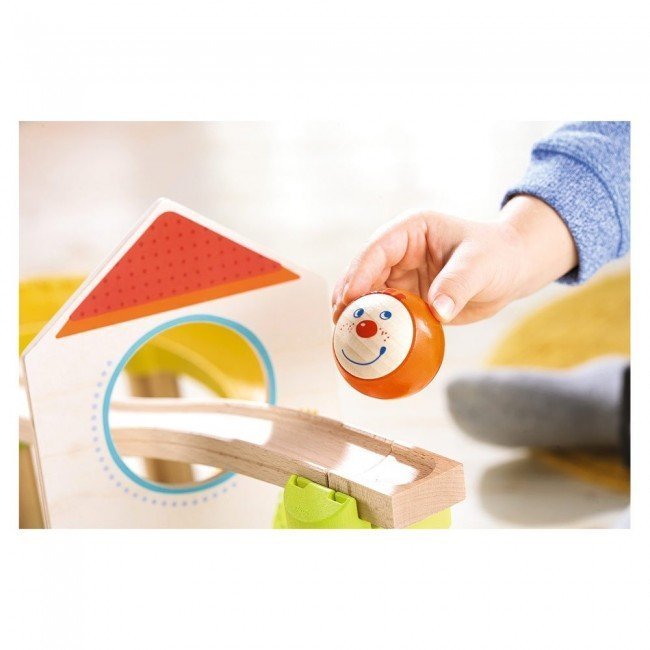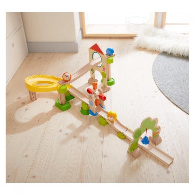 Un toboggan à billes contenant 3 boules en bois qui dévaleront le circuit à toute allure. Un jouet en bois fabriqué en Allemagne par Haba.