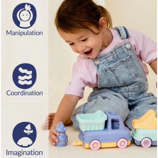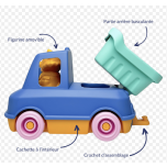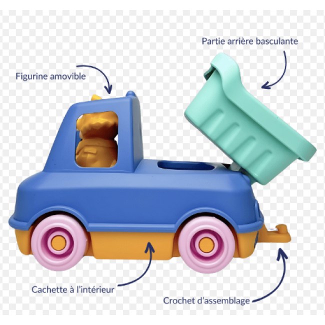 Ce jouet est compatible avec les autres Camions-Trains de la gamme. Ils s’assemblent grâce à leurs crochets et forment un petit train.