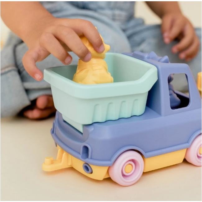 100% plastique recyclé PEHD, boîte 100% carton recyclé certifié FSC. Jouet et boîte 100% recyclables.