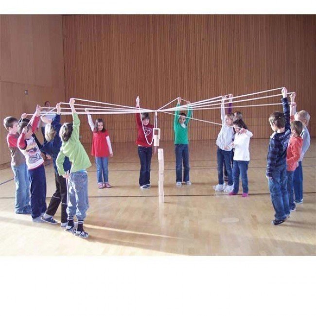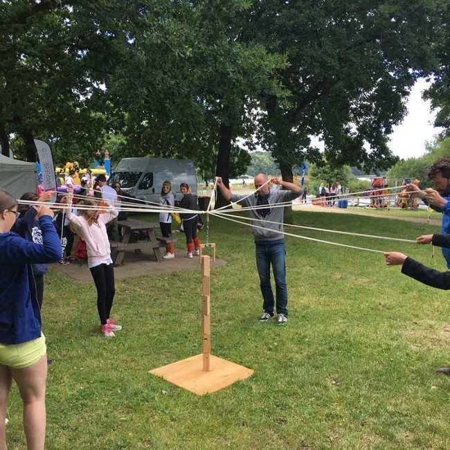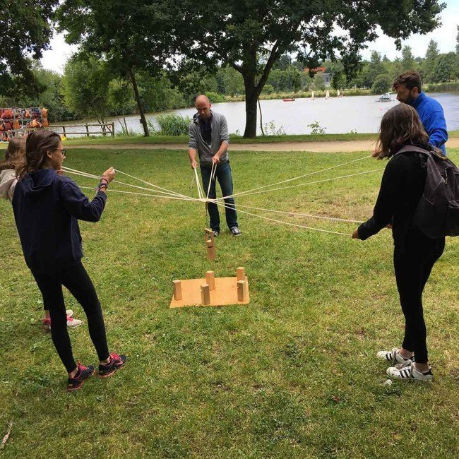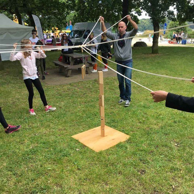 Chaque personne a une ou plusieurs cordes à la main et forment un cercle de telle sorte que le dispositif de suspension puisse être aligné sur les plots. Après avoir placé le dispositif dans la rainure d'un bloc il va falloir constituer la tour sans que celle-ci ne bascule. Le groupe devra ainsi coopérer afin de placer correctement les blocs.