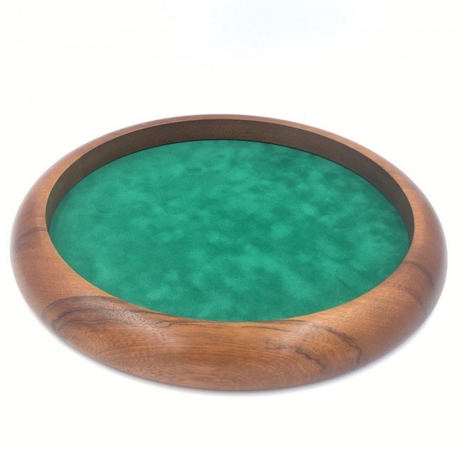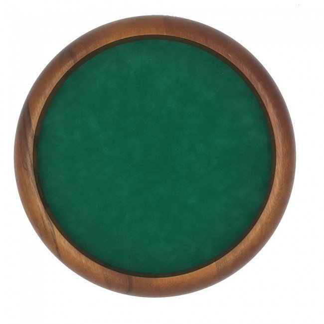 Une piste de dés ronde en bois de Fraké, mesurant 35 cm de diamètre et 4 cm de hauteur. Piste en feutrine verte.