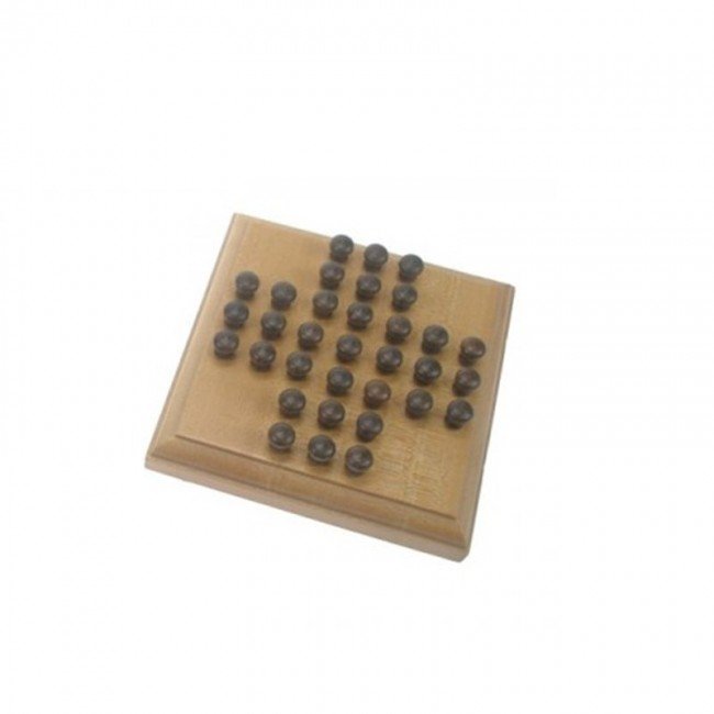Règle du jeu : Pour supprimer des billes, il faut que deux billes soient adjacentes et suivies d'une case vide. La première bille « saute » par-dessus la seconde et rejoint la case vide. La seconde bille est alors retirée du tablier. Une bille ne peut sauter qu'horizontalement ou verticalement, et une seule à la fois..