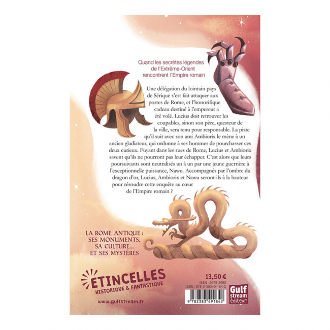 Résumé : Une délégation du lointain pays de Sérique s'est fait attaquer aux portes de Rome, et l'honorifique cadeau destiné à l'empereur a été volé. Lucius doit retrouver les coupables, sinon son père, questeur de la ville, sera tenu pour responsable. La piste qu'il suit avec son ami Ambiorix le mène à un ancien gladiateur, qui ordonne à ses hommes de pourchasser ces deux curieux. Fuyant dans les rues de Rome, Lucius et Ambiorix savent qu’ils ne pourront pas leur échapper. C’est alors que leurs poursuivants sont neutralisés un à un par une jeune guerrière à l’exceptionnelle puissance, Nawu. Accompagnés par l’ombre du dragon d’or, Lucius, Ambiorix et Nuwa seront-ils à la hauteur pour résoudre cette enquête au coeur de l’Empire romain ?
