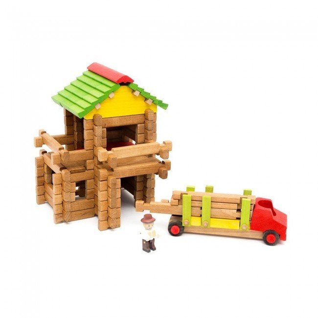 Ce chalet en bois conçu par Jeujura est spécialement adapté pour les enfants dès 3 ans. Il contient 94 pièces en bois de hêtre massif + un camion permettant de construire un petit chalet et un véhicule.