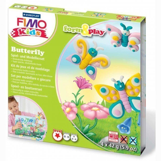 Les kit de pâtes Fimo Staedtler sont les équipements parfaits des jeunes bricolos en herbe. La pâte est modelée, puis on la laisse durcir au four pour obtenir des papillons super originaux !