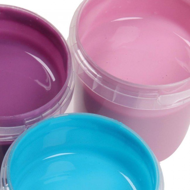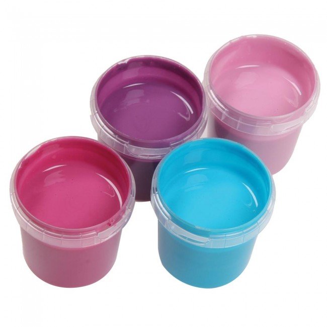4 pots de 150 gr de peinture aux doigts écologiques (rose clair, rose, mauve et bleu turquoise) pour les artistes en herbe. Vous pouvez utiliser cette peinture avec un pinceau, une éponge ou les doigts...