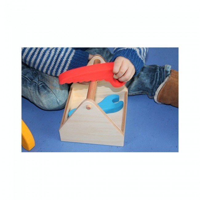 Une belle boîte à outils en bois massif taillés à la main, pour les mains délicates. Contient 3 outils en bois.