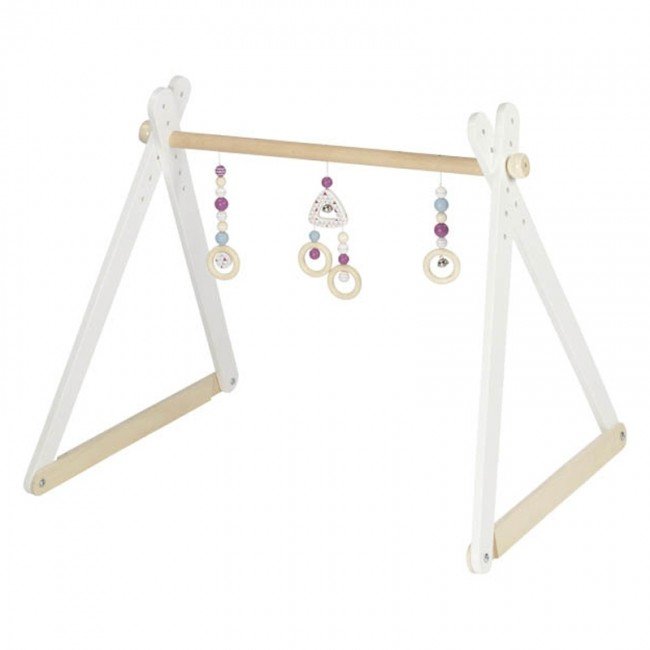 Un joli portique d'activités en bois conçu pour éveiller bébé au monde qui l'entoure. Les différentes perles en bois suscitent l'attention et la curiosité et participent au développement de la motricité.