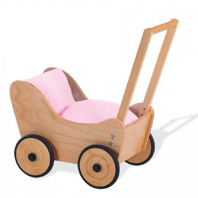 Une belle poussette en hêtre laqué destinée à promener ses poupées. Equipée de freins, cette poussette est idéale pour les plus jeunes.
