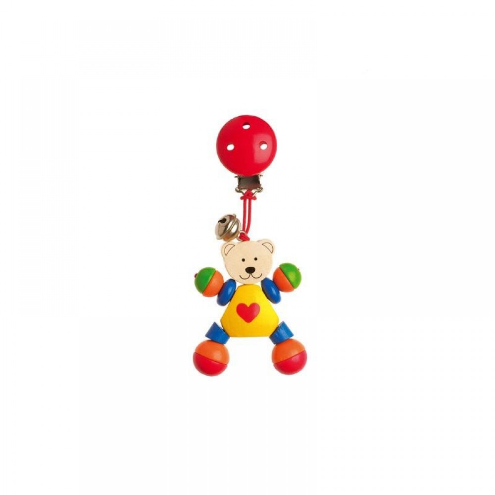 Grâce au clip, ce petit jouet en bois ne sera jamais perdu.