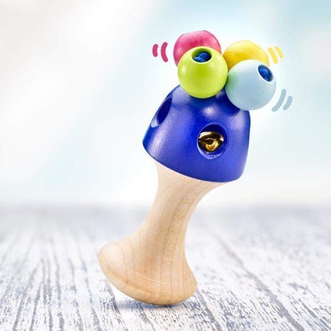 Un hochet en bois à manche, facile à saisir pour les petites mains de bébé. En le secouant, bébé découvrira le tintement du grelot intégré et des perles en bois. Un premier jouet en bois recommandé dès la naissance.