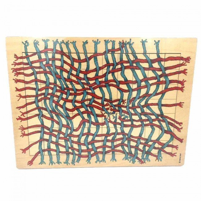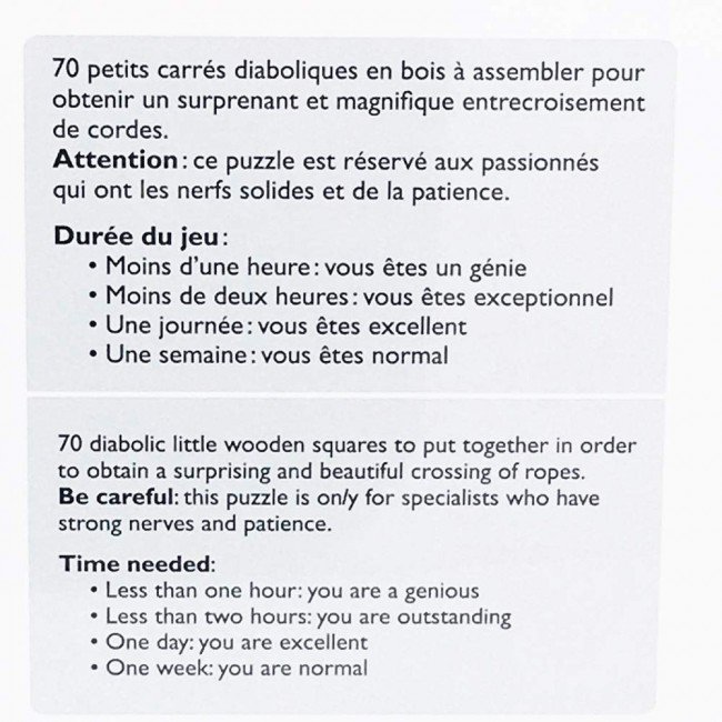 Un puzzle véritablement diabolique...70 petits carrés en bois à assembler pour obtenir un surprenant et magnifique entrecroisement de cordes.