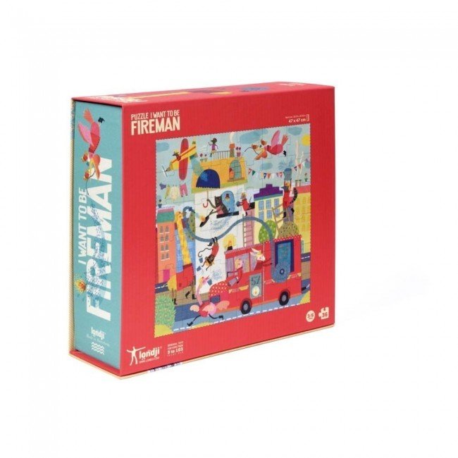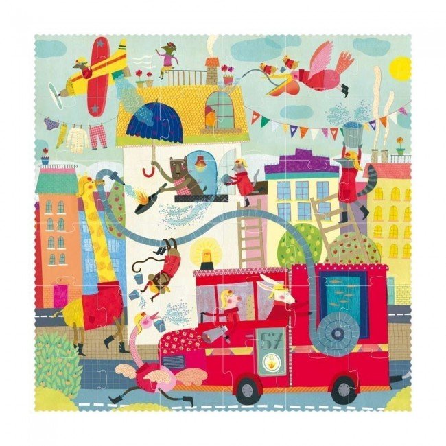 Une interprétation originale du métier de pompier à travers cette illustration...La girafe prête main forte à son collègue pompier, le singe en profite pour faire ses galipettes, le pélican arrive par les airs avec sa réserve...