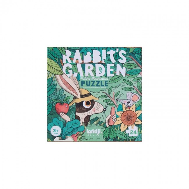 Ce puzzle Londji "Rabbit's garden" illustre des lapins qui cultivent des fruits et des légumes dans leur jardin. Idéal pour découvrir l'univers du jardin et observer ce qui y pousse. Dès 3 ans.