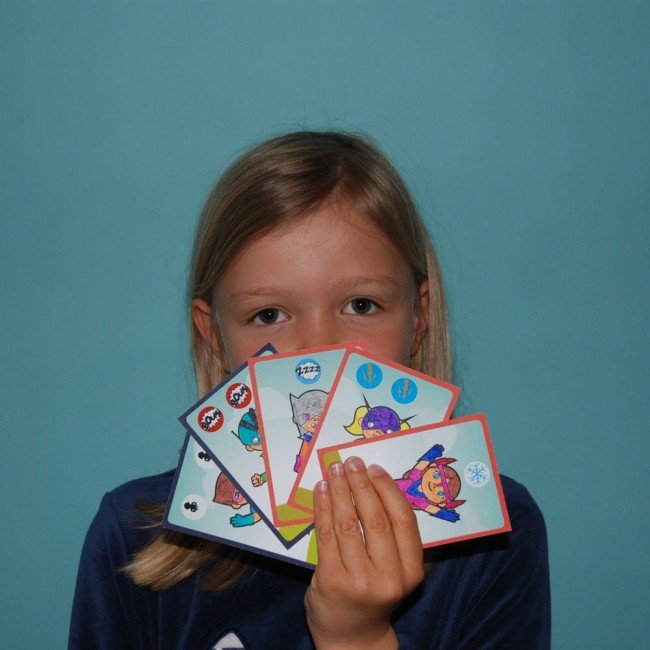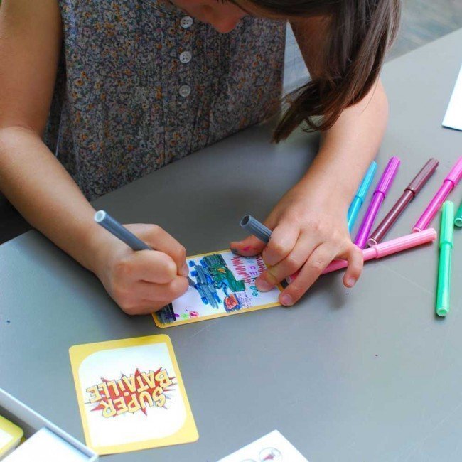 Super Bataille allie un jeu de cartes et un loisir créatif. Commencez en personnalisant le jeu à votre image. Coloriez les 18 cartes Supers Héros ou Héroïnes. Ensuite collez les autocollants supers pouvoirs sur les cartes de supers héros. Enfin il faut créer vous même les cartes jokers grace aux 6 cartes jokers vierges, en jeu on en utilise seulement 2, vous pouvez donc en réaliser plusieurs et changer de carte à chaque partie. Le loisir créatif dure environ 2h. Vous pourrez jouer même si la personnalisation de votre jeu n'est pas complétemant terminée.