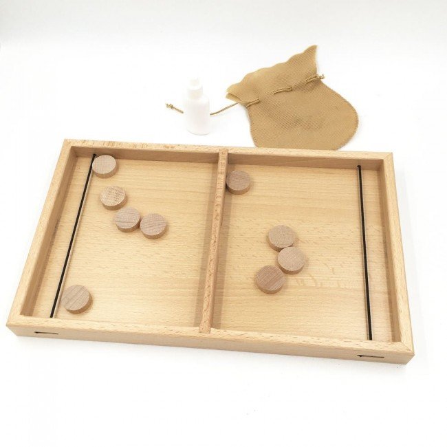 Règle du jeu : Les 2 joueurs en même temps, tentent à l'aide d'un élastique d'envoyer tous les palets dans le camp adverse. En début de partie, chaque joueur a 5 palets dans son camp. Chaque joueur place ses palets où il le souhaite dans son camp excepté devant la trappe. Le passage entre chaque camp est étroit. Les joueurs doivent jouer le plus rapidement possible. Le joueur qui parviendra à passer tous ses palets dans le camp adverse sera désigné vainqueur.