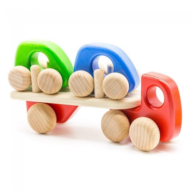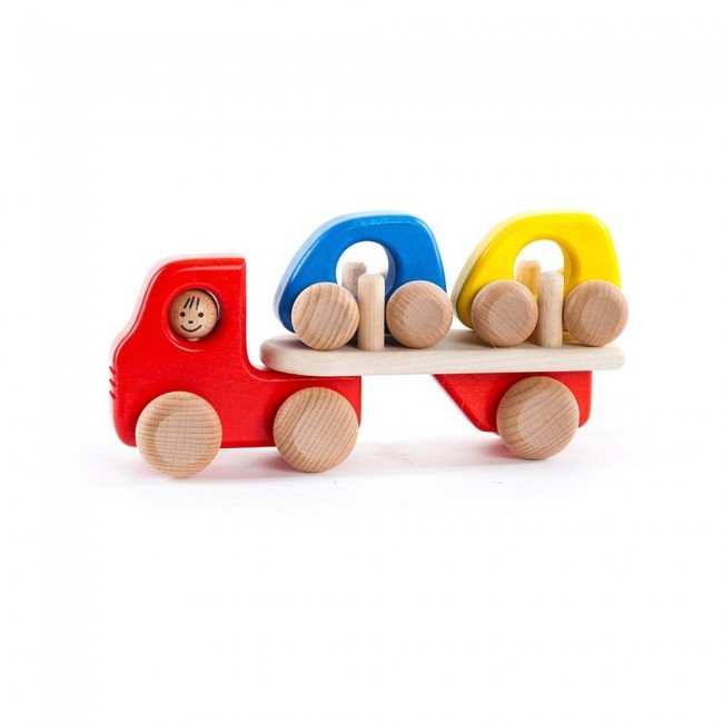 Un camion transportant 2 véhicules très faciles à prendre en main grâce aux formes arrondies. Ces véhicules sont colorés avec des peintures à base de composants naturels.