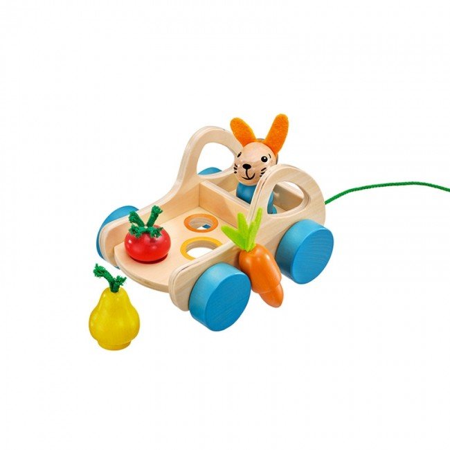 Un véhicule conduit par un petit lapin qui vient de charger ses fruits et légumes pour aller les livrer...Une carotte, une poire, une tomate et un petit lapin, trois fruits et légumes et un personnage, à nommer, identifier et enficher en fonction de leur couleur. Un jeu de tri et d'identification favorisant la motricité des enfants dès 12 mois.