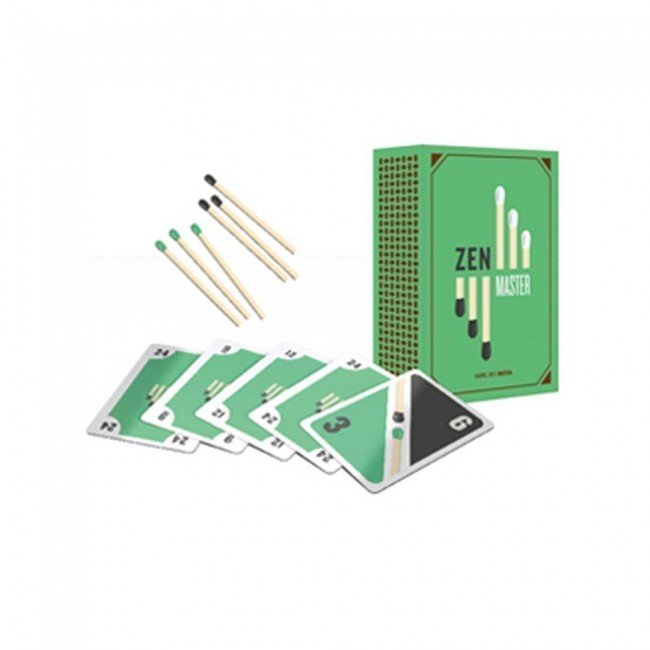 Règle du jeu : Distribue 9 cartes-nombre à chaque joueur, elles sont numérotées de 1 à 50. Retourne une carte score au centre, elle montre un chiffre blanc et un chiffre noir. A chaque tour, chaque joueur pose une de ses cartes-nombre. La plus haute et la plus basse remportent des allumettes blanches et noires suivant les chiffres de la carte-score. Aux manches suivantes, les allumettes noires et blanches récupérées s'annulent. ZenMaster est un jeu rapide de tactique, de hasard et d'ambiance.